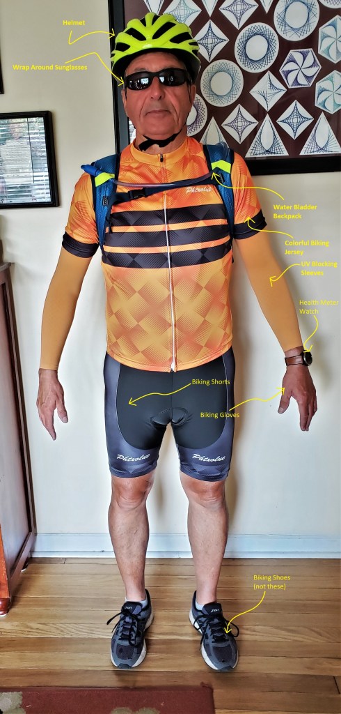 A primary consideration in biking wear should be your visibility on the road. Colors should not blend in with the surroundings. The helmet should be a bright color, even a fluorescent color. Drivers tend to not see cyclists on the road. The cyclist can help them by wearing bright colors.